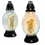 - znicz szklany w kolorze złotym z ozdobnym, naklejanym motywem róży