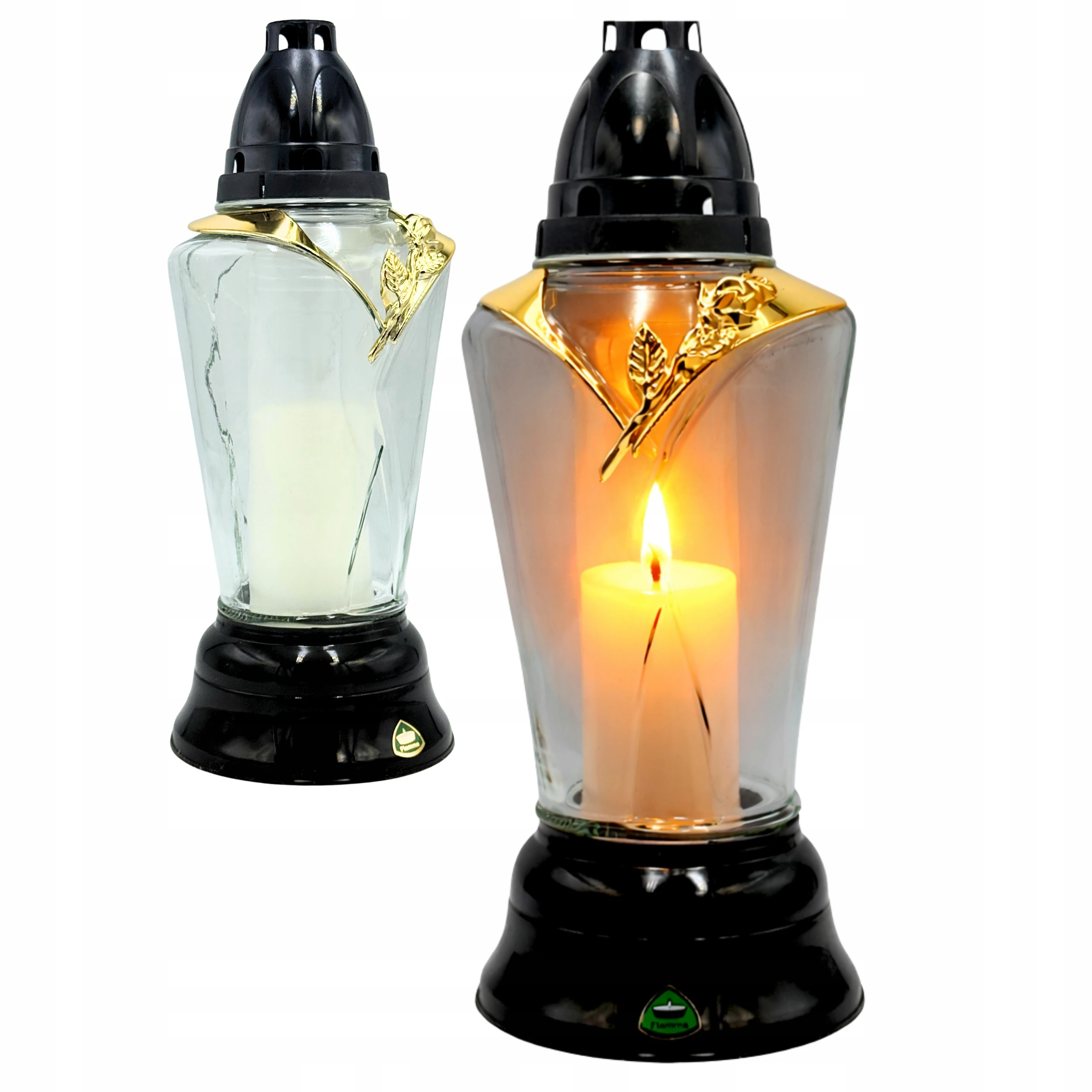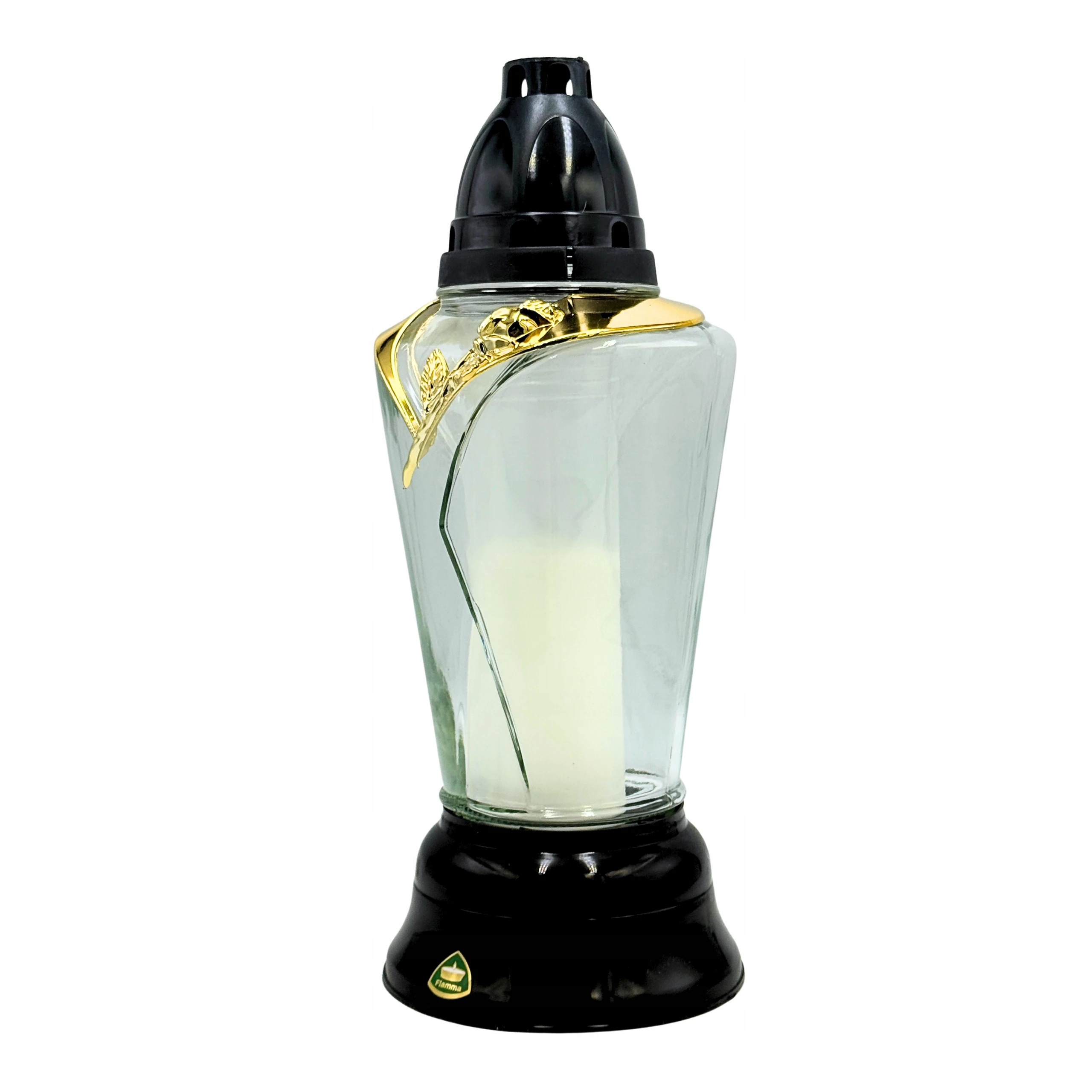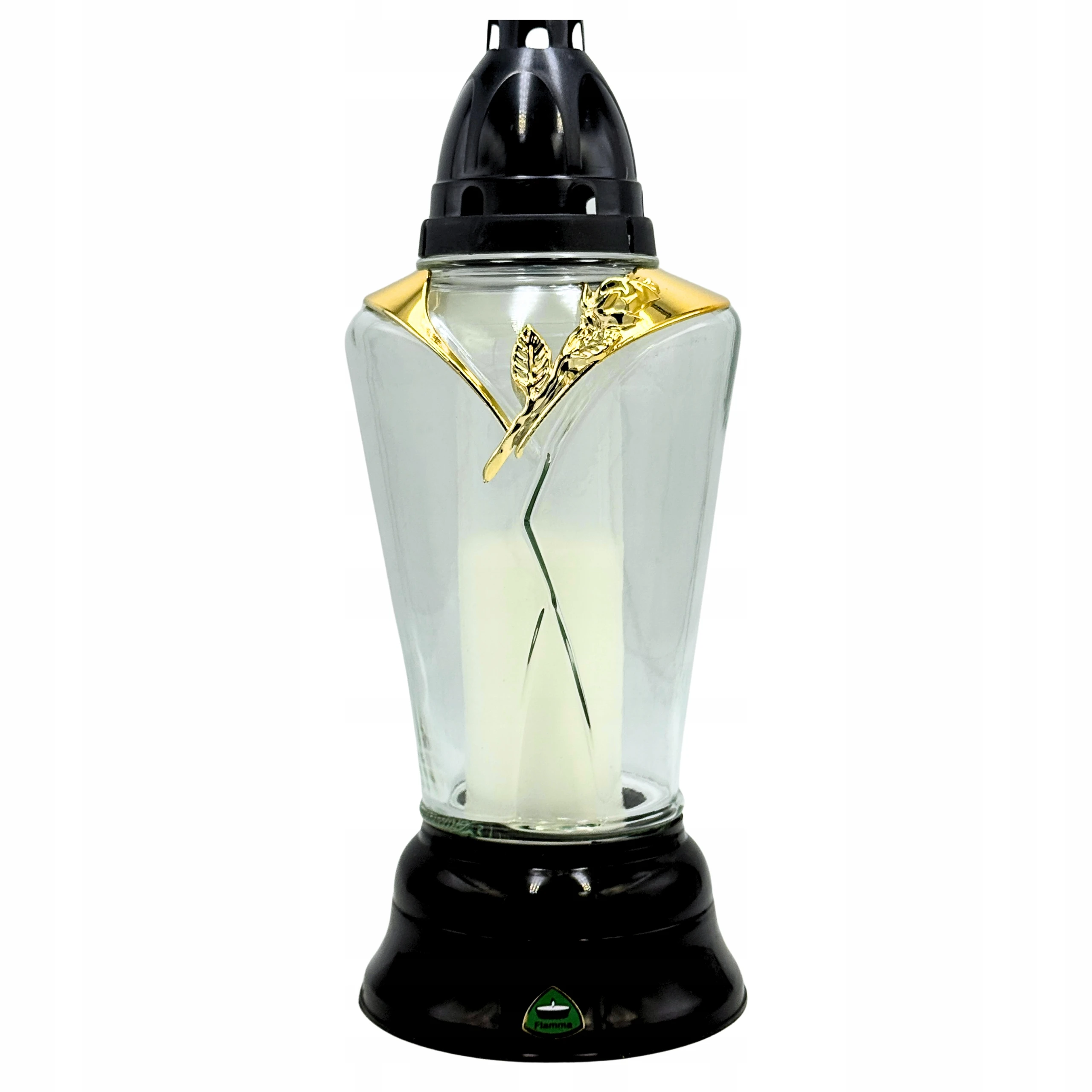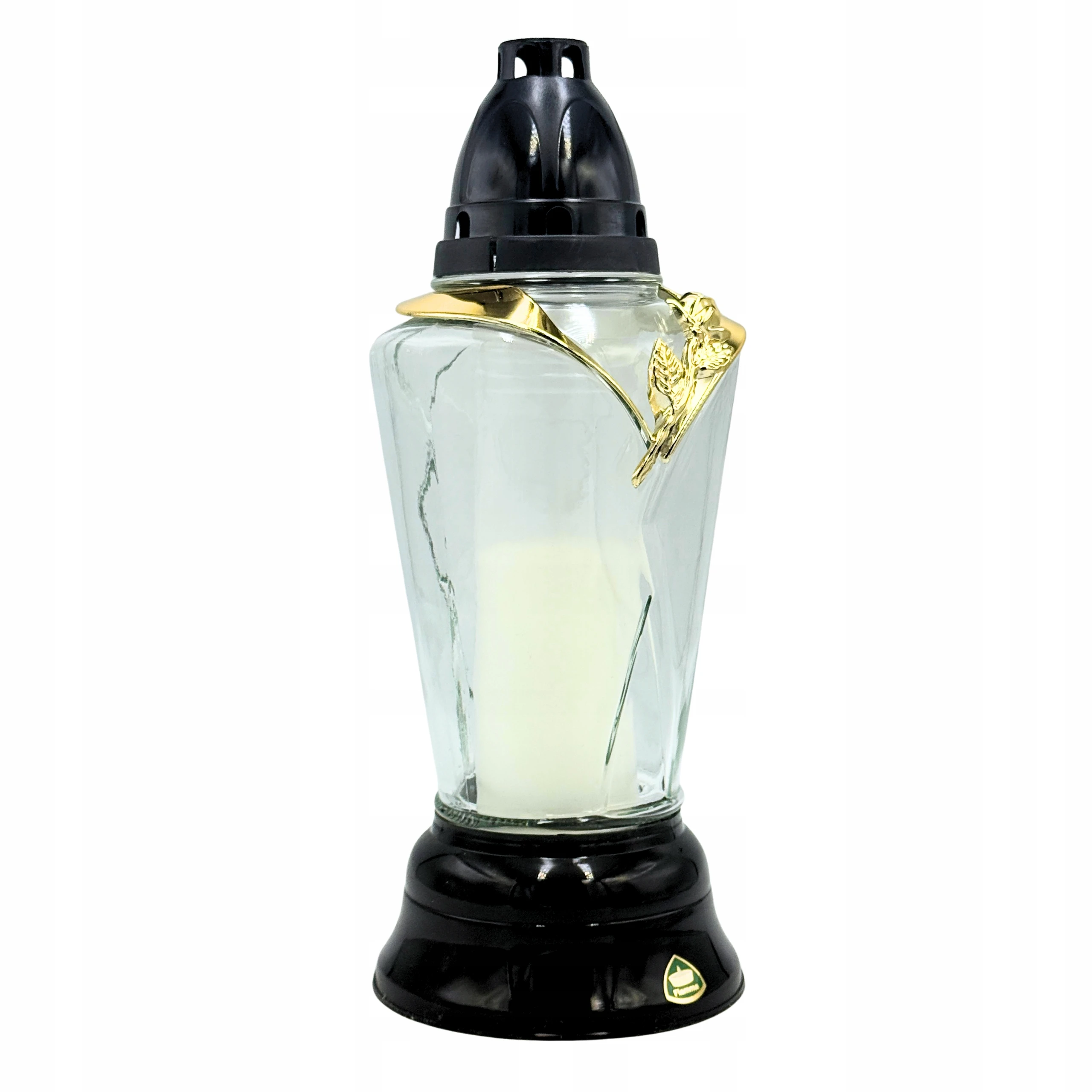 Znicz szklany czarno-złoty róża 31 cm + Wkład parafinowy