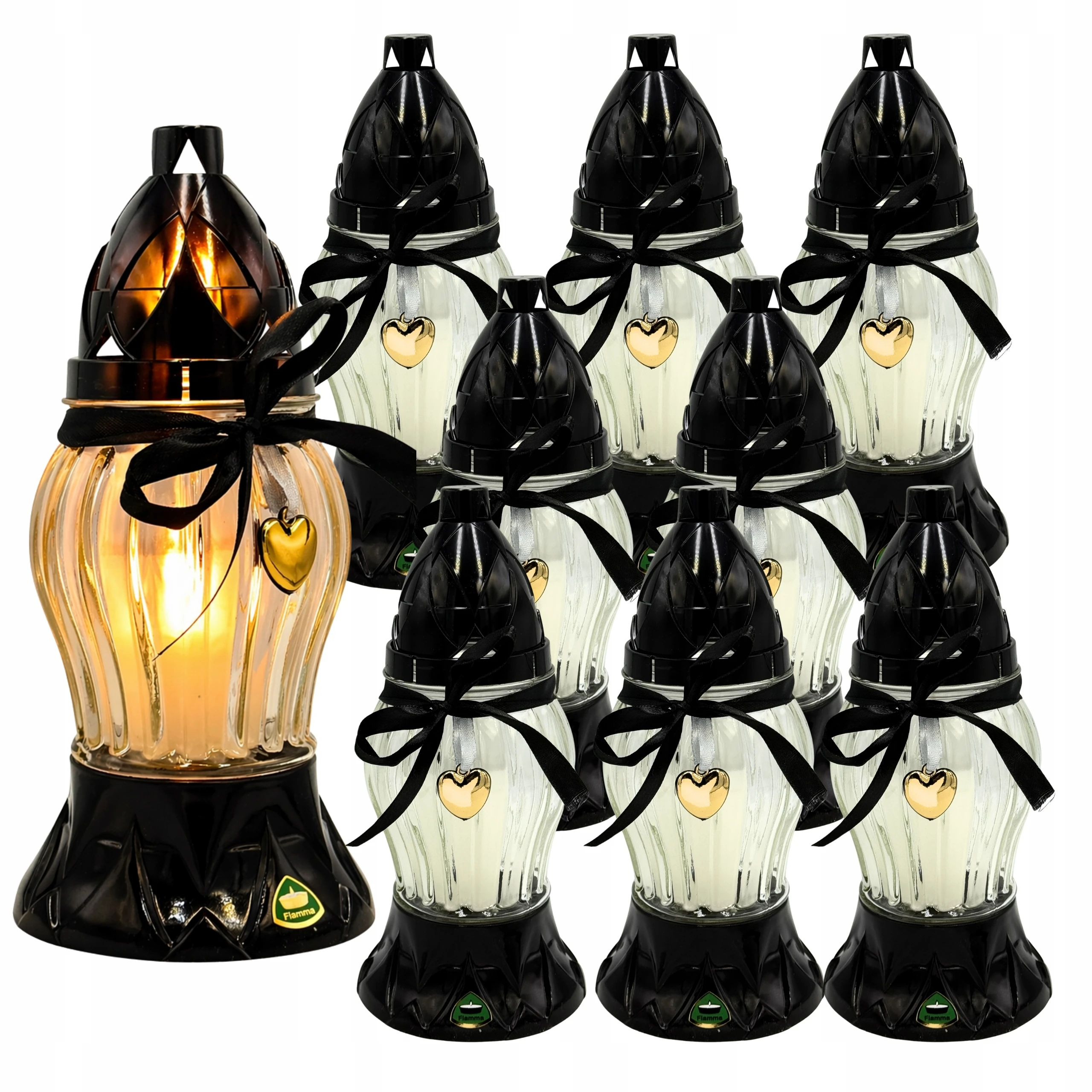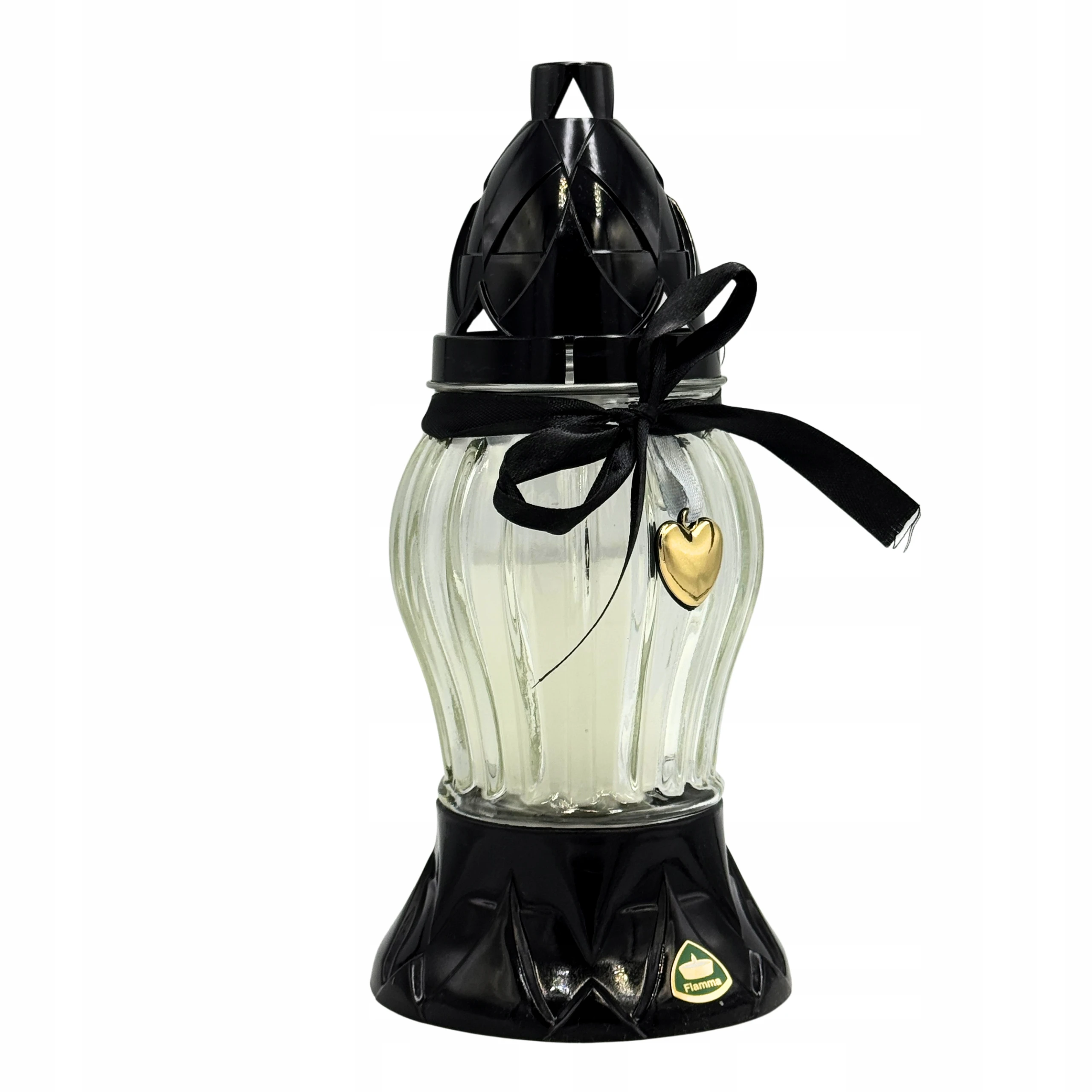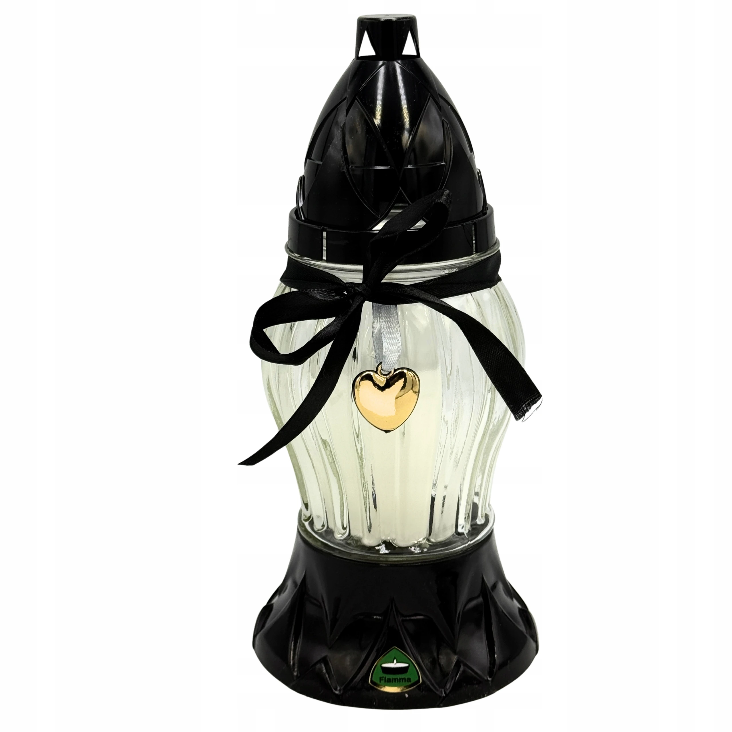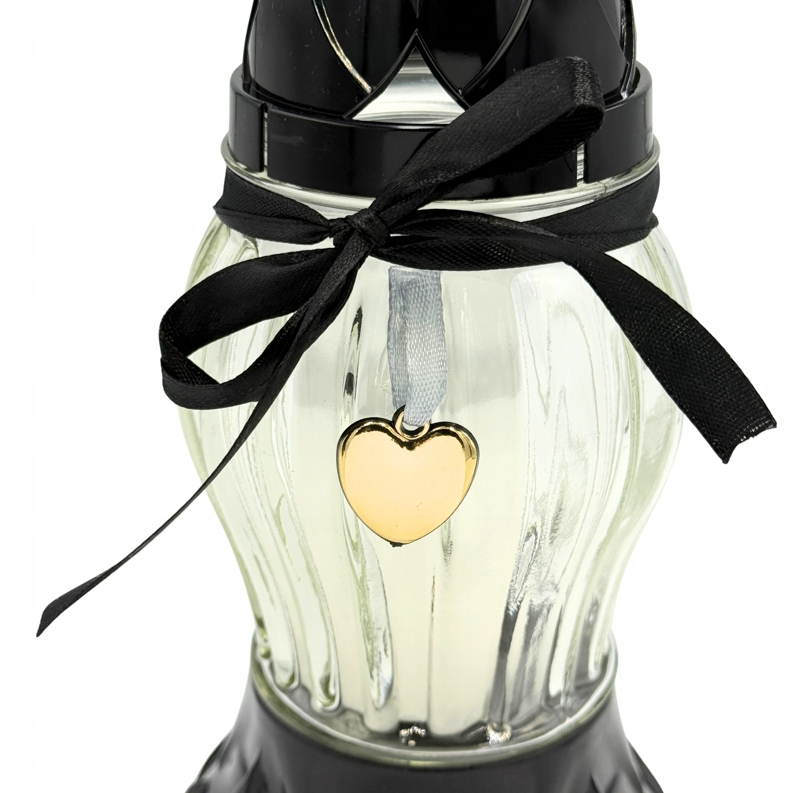 Zestaw 8 zniczy szklanych z serduszkiem i czarną kokardą to elegancka propozycja dla osób, które chcą stworzyć spójną i estetyczną oprawę miejsca pamięci. Każdy znicz został ozdobiony subtelnym złotym serduszkiem oraz czarną kokardą, dzięki czemu całość prezentuje się delikatnie, stylowo i z wyczuciem