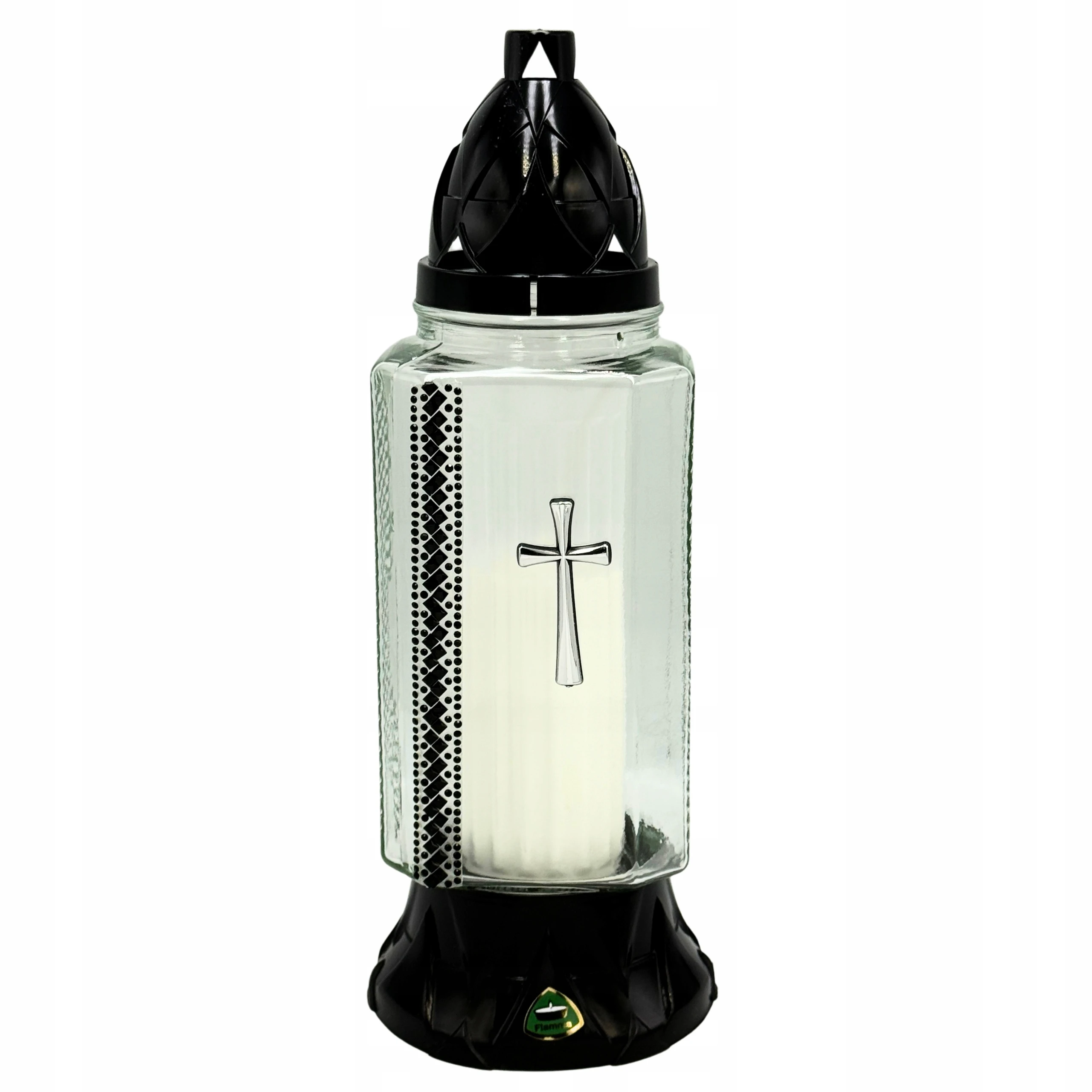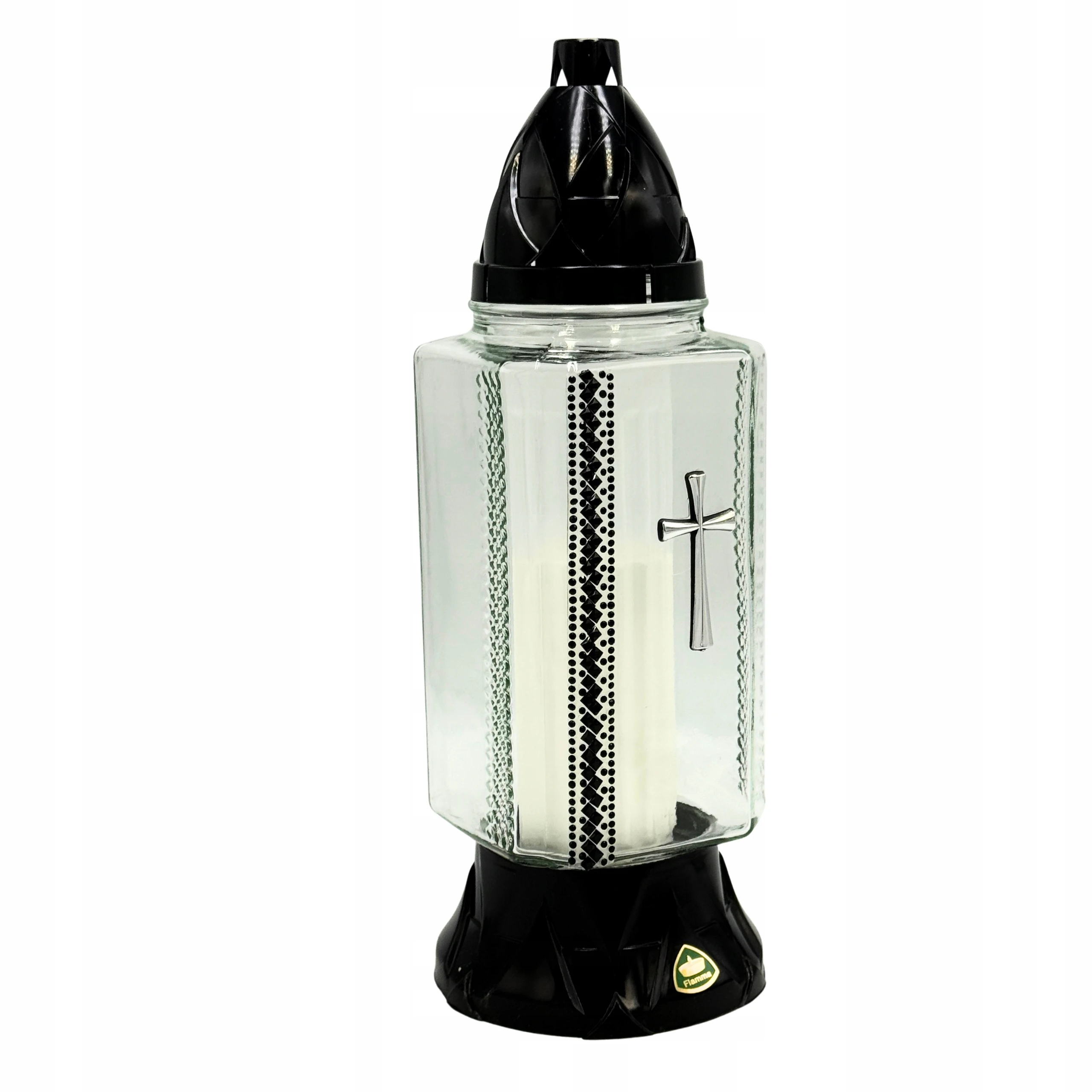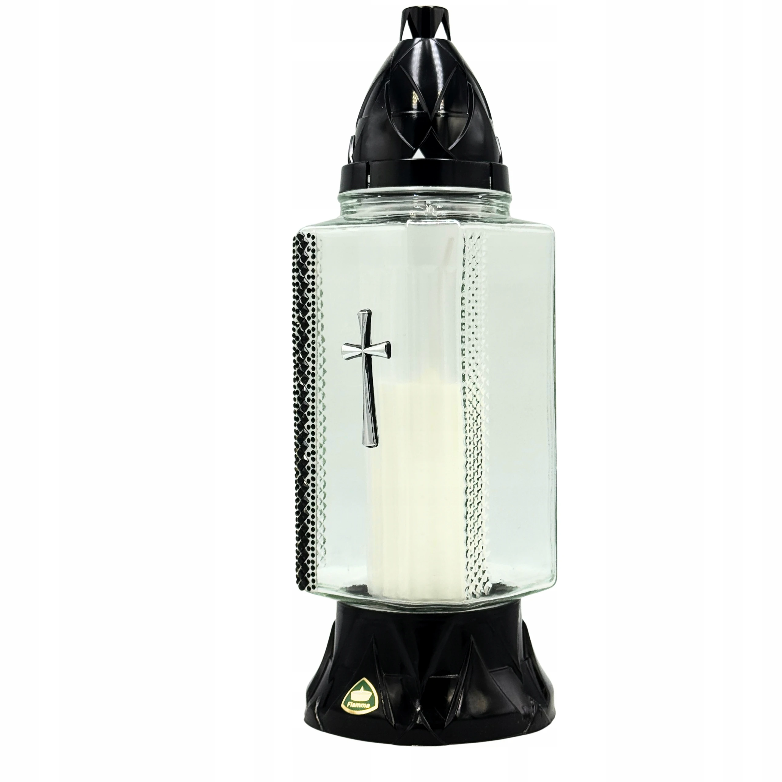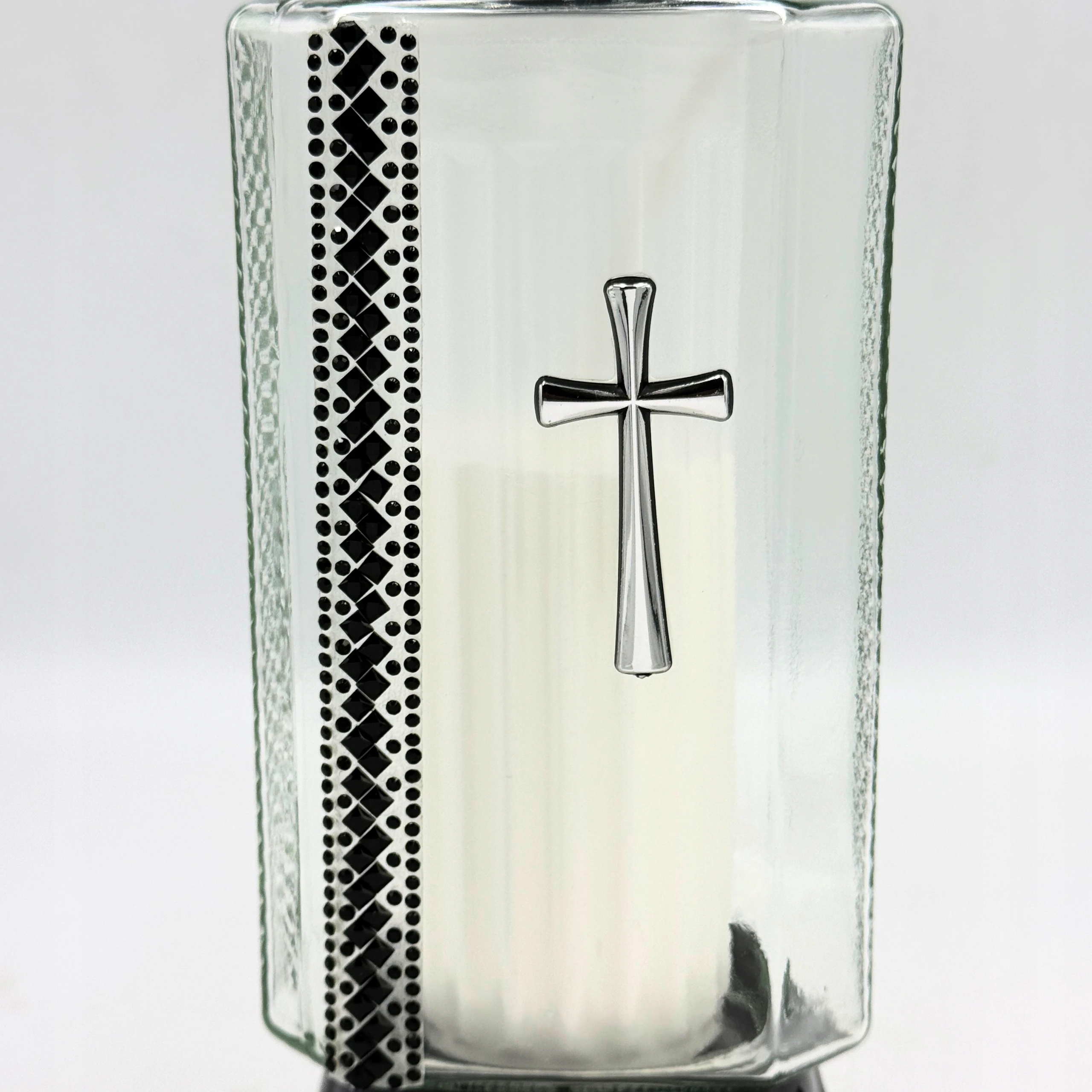- znicz szklany z ozdobnym motywem krzyża i cyrkoniami
